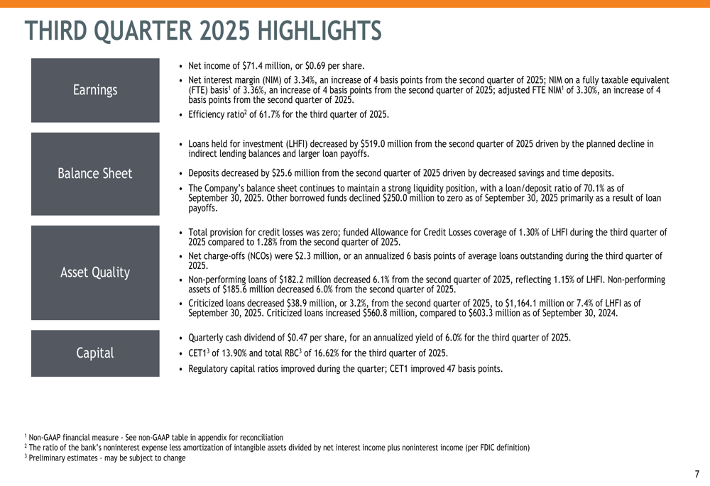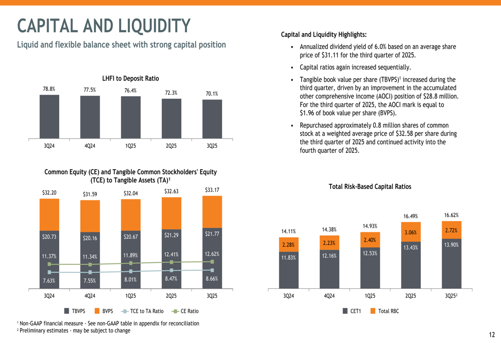 The bank’s capital position continues to strengthen, with Common Equity Tier 1 (CET1) ratio at 13.90% and total risk-based capital at 16.62%. The tangible common equity to tangible assets ratio stood at 8.66%, providing substantial loss-absorbing capacity. The loan-to-deposit ratio decreased to 70.1% in Q3 2025 from 78.8% a year earlier, highlighting improved liquidity.