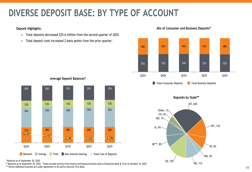 First Interstate’s deposit base remains diverse both geographically and by account type. Total deposits decreased by $25.6 million from Q2 2025, while deposit costs increased by just 2 basis points quarter-over-quarter. The deposit mix includes a healthy proportion of non-interest bearing accounts, helping to moderate overall funding costs.
