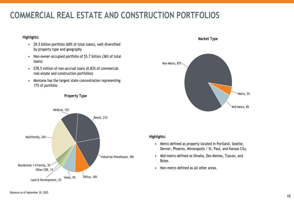 The commercial real estate portfolio, which represents 60% of total loans, is well-diversified by property type and geography. Montana represents the largest state concentration at 17% of the portfolio, with multifamily (24%), retail (21%), and industrial/warehouse (18%) comprising the largest property type segments.