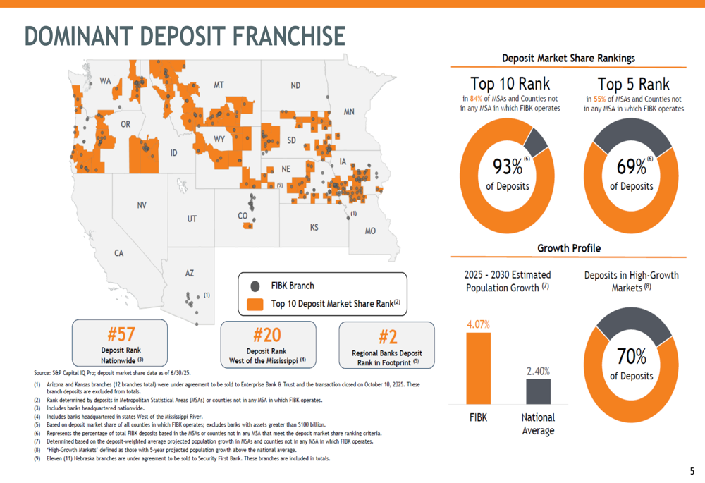 A key competitive advantage is the bank’s presence in high-growth markets, with 70% of deposits in areas expected to outpace the national average for population growth. FIBK’s markets are projected to grow 4.07% between 2025-2030, compared to the national average of 2.40%.