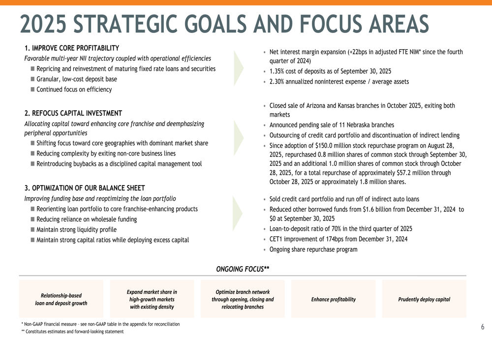First Interstate has embarked on a strategic repositioning effort focused on three key areas: improving core profitability, refocusing capital investment, and optimizing the balance sheet. The company has already completed the sale of its Arizona and Kansas branches and has an agreement to sell 11 Nebraska branches to Security First Bank.