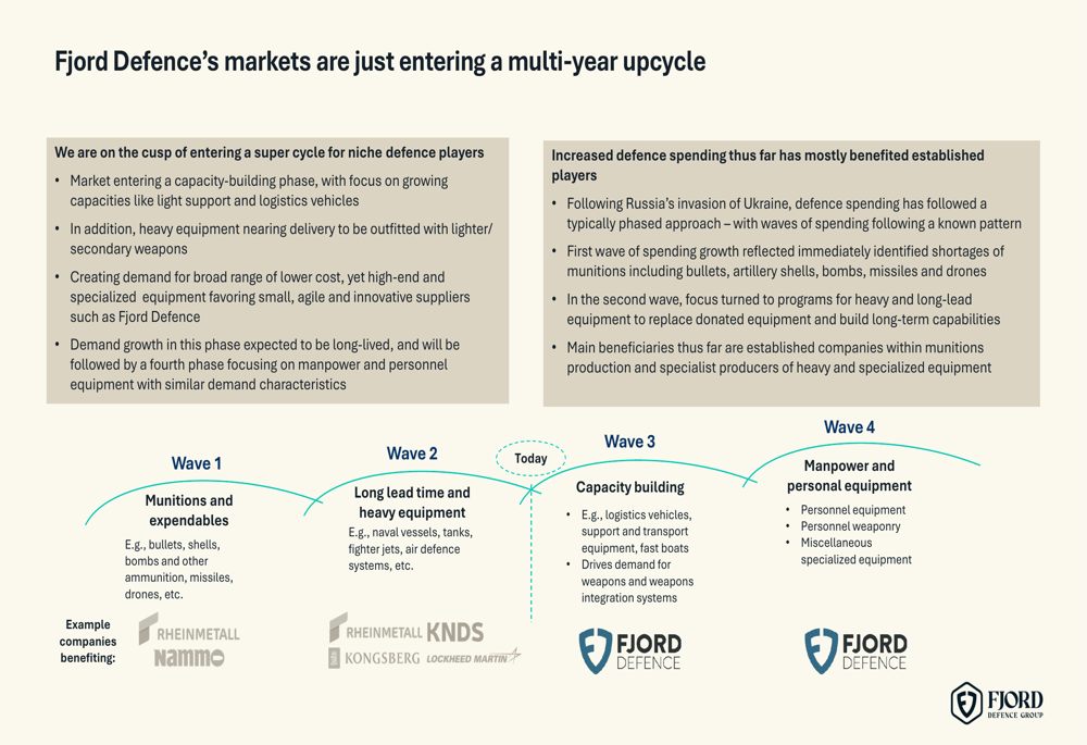 Management believes that the defense industry is entering what they describe as a "super cycle" for niche players like Fjord Defence. The company is strategically positioned to capitalize on the later phases of defense spending increases, which typically follow initial investments in munitions and heavy equipment: