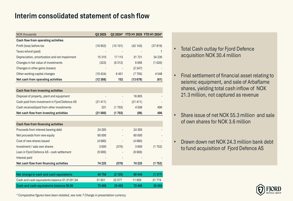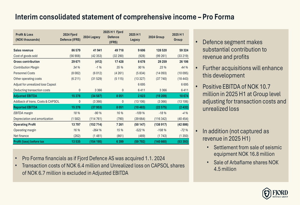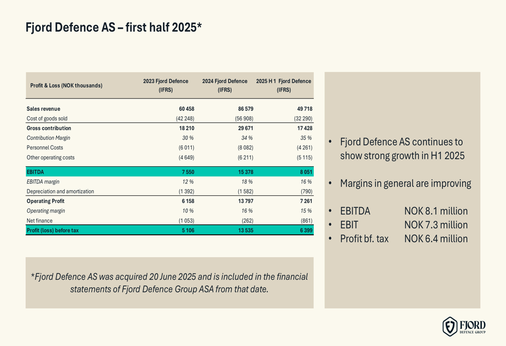 Fjord Defence AS, acquired on June 20, 2025, delivered strong results in the first half of 2025 with revenues of NOK 49.7 million, EBITDA of NOK 8.1 million, and EBIT of NOK 7.3 million. The company’s performance is illustrated in the following financial summary: