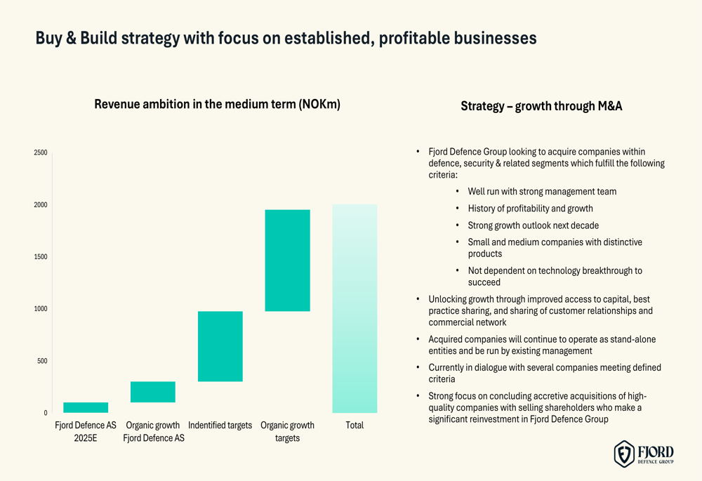 Fjord Defence Group’s growth strategy centers on a "buy and build" approach, focusing on acquiring established, profitable businesses within the defense and security sectors. The company has set ambitious revenue targets through both organic growth and strategic acquisitions: