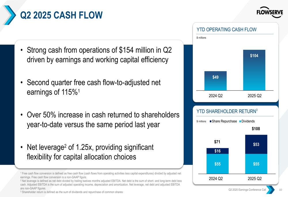 Flowserve’s Q2 2025 presentation painted a picture of a company successfully navigating challenging market conditions through operational excellence and strategic focus on higher-margin business. The significant margin expansion and strong cash generation enabled the company to increase shareholder returns while maintaining a healthy balance sheet with net leverage of 1.25x.