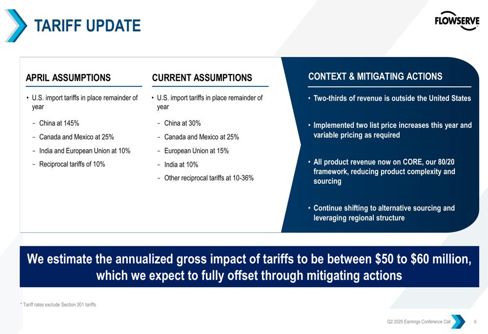 The company is also actively managing the impact of tariffs, which have evolved since its previous guidance. Flowserve estimates the annualized gross impact of tariffs to be between $50-60 million but expects to fully offset this through mitigating actions including price increases, product simplification, and alternative sourcing.