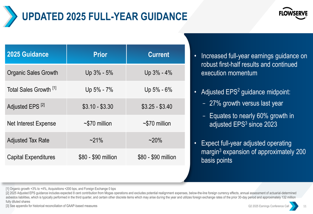 Based on strong first-half performance, Flowserve raised its full-year 2025 earnings guidance. The company now expects adjusted EPS of $3.25-$3.40, up from the previous guidance of $3.10-$3.30. This represents approximately 27% growth versus the prior year and nearly 60% growth since 2023.