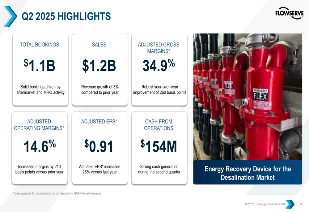 Flowserve’s second quarter demonstrated robust financial performance across key metrics, with particularly strong improvements in profitability measures. The company achieved revenue growth of 3% year-over-year to $1.2 billion, while adjusted gross margins expanded by 260 basis points to 34.9%.