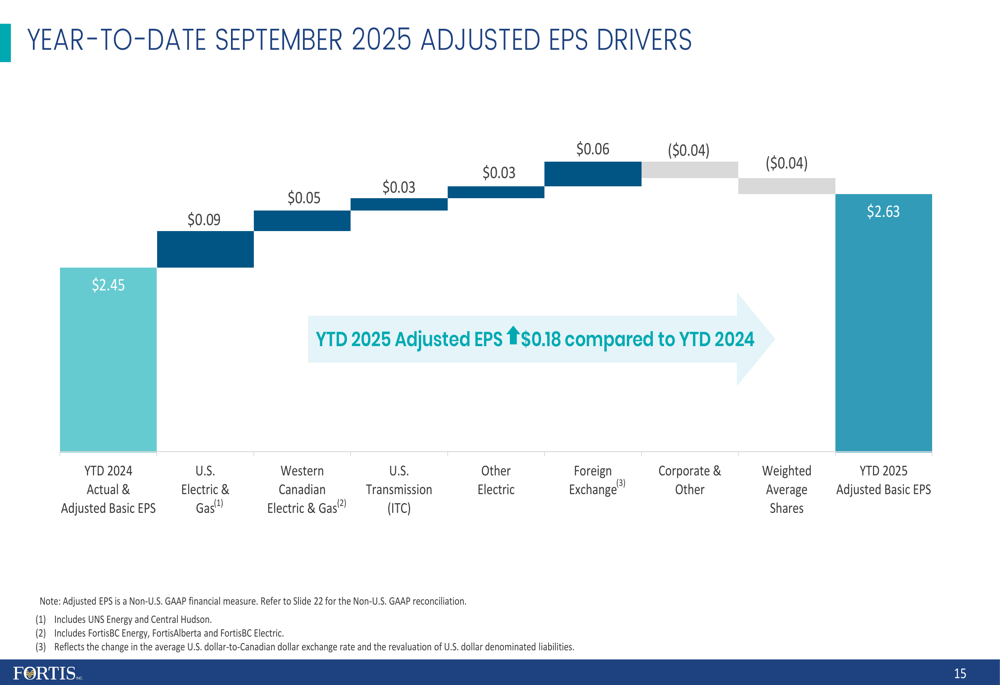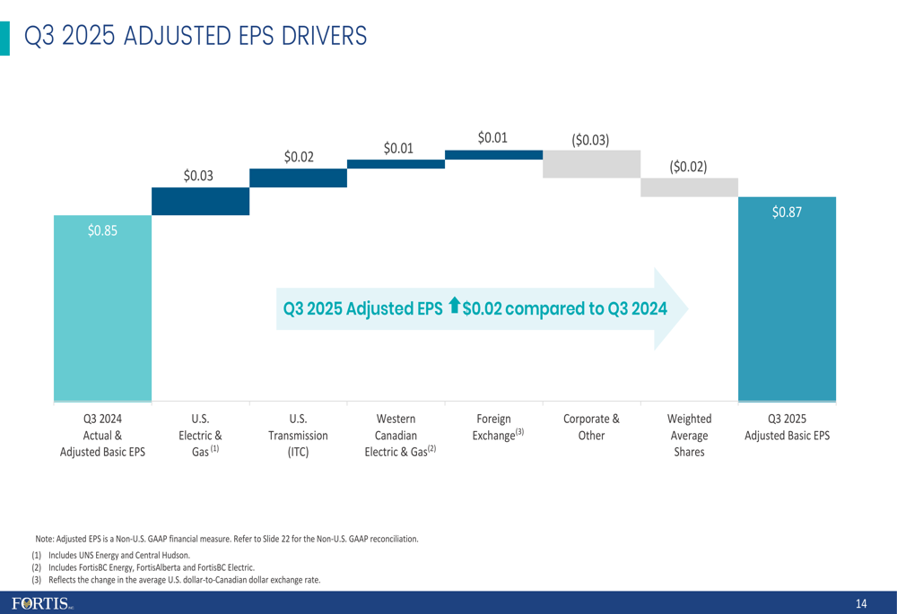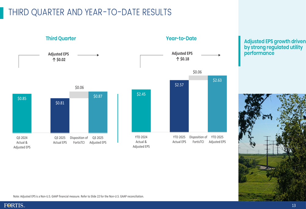 Fortis delivered adjusted earnings per share of $0.87 for Q3 2025, representing a 2.4% increase from $0.85 in Q3 2024. Year-to-date adjusted EPS reached $2.63, up 7.3% from $2.45 in the comparable period of 2024. The company also reported actual EPS of $0.81 for the quarter, with the difference primarily attributed to the disposition of FortisTCI.