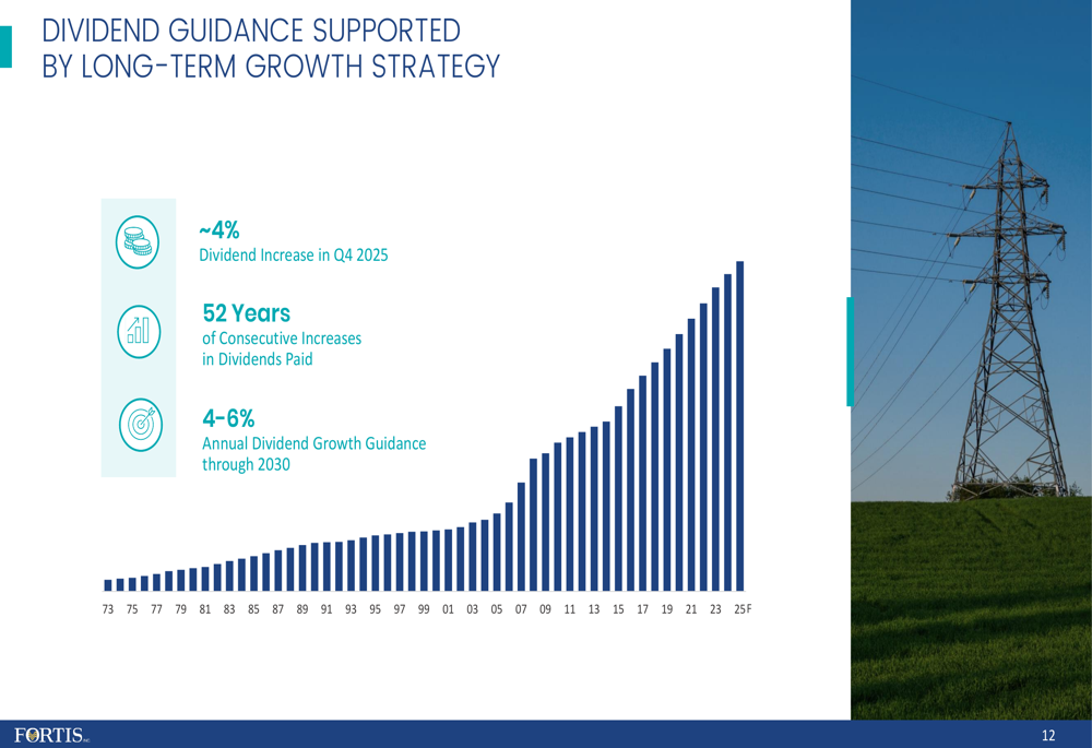 Fortis announced a dividend increase of approximately 4% for Q4 2025, marking the 52nd consecutive year of dividend increases. The company also extended its 4-6% annual dividend growth guidance through 2030, reinforcing its commitment to delivering consistent shareholder returns.