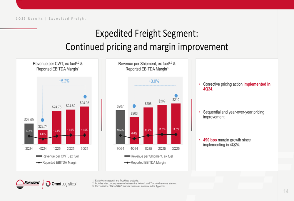 The Expedited Freight segment reported revenue of $259 million, a 9.2% decrease compared to Q3 2024. However, the segment achieved margin improvement, with EBITDA margin increasing from 10.4% to 11.5% year-over-year. This improvement reflects the company's focus on pricing discipline and operational efficiency.