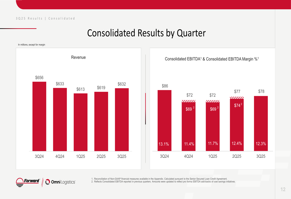 Forward Air reported Q3 2025 revenue of $632 million with consolidated EBITDA of $78 million, representing a 12.3% margin. Operating income reached $15 million for the quarter. The company has maintained EBITDA stability compared to the previous quarter while improving operating cash flow by $27 million sequentially.