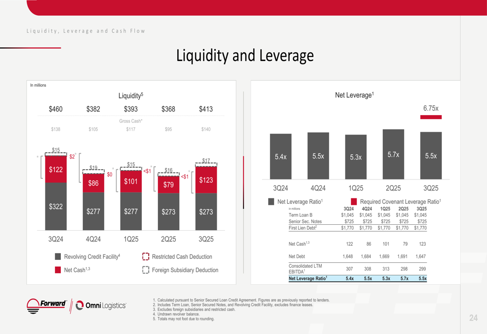 Forward Air reported total liquidity of $413 million, comprising $140 million in unrestricted cash and $273 million in revolver availability. The company's cash position improved by $45 million from Q2 2025 to Q3 2025.