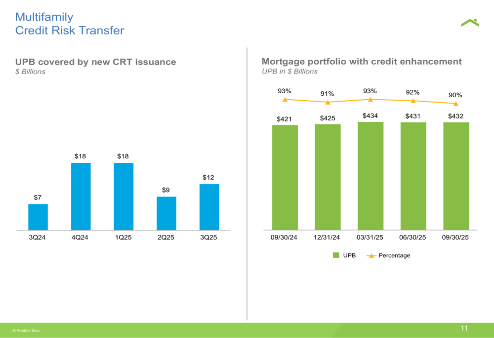 The multifamily segment showed even stronger risk transfer activity, with 90% of the portfolio covered by credit enhancements. The UPB covered by new multifamily CRT issuance increased from $7 billion in Q3 2024 to $12 billion in Q3 2025.