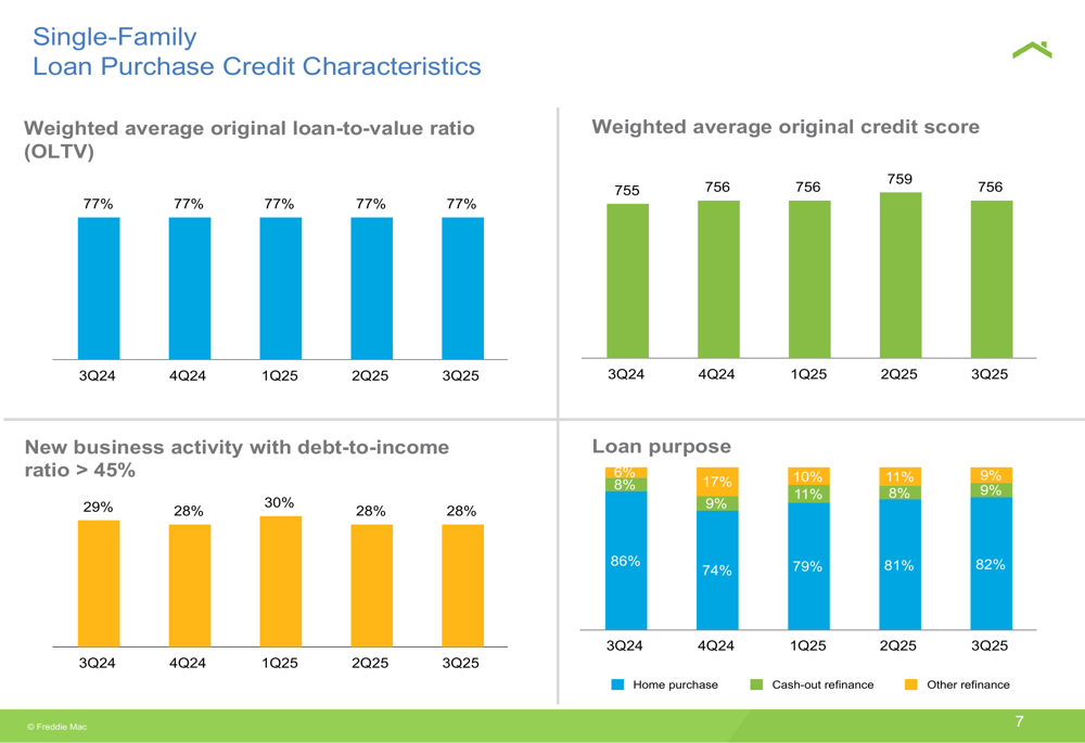 In the single-family segment, Freddie Mac maintained strong credit quality in its new loan purchases. The weighted average original credit score remained high at 755-759 throughout the past year, while the weighted average original loan-to-value ratio held steady at 77%.