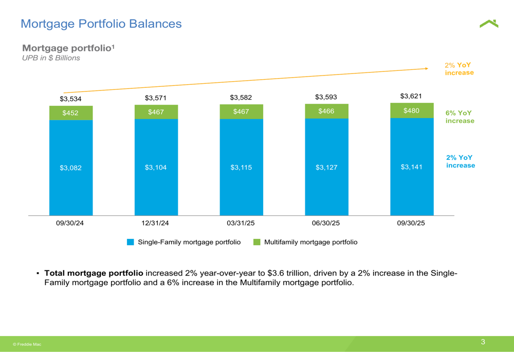 Despite the challenging interest rate environment, Freddie Mac’s mortgage portfolio continued to grow steadily. The total mortgage portfolio reached $3.62 trillion, with the single-family segment growing 2% year-over-year to $3.14 trillion and the multifamily portfolio increasing 6% to $480 billion.