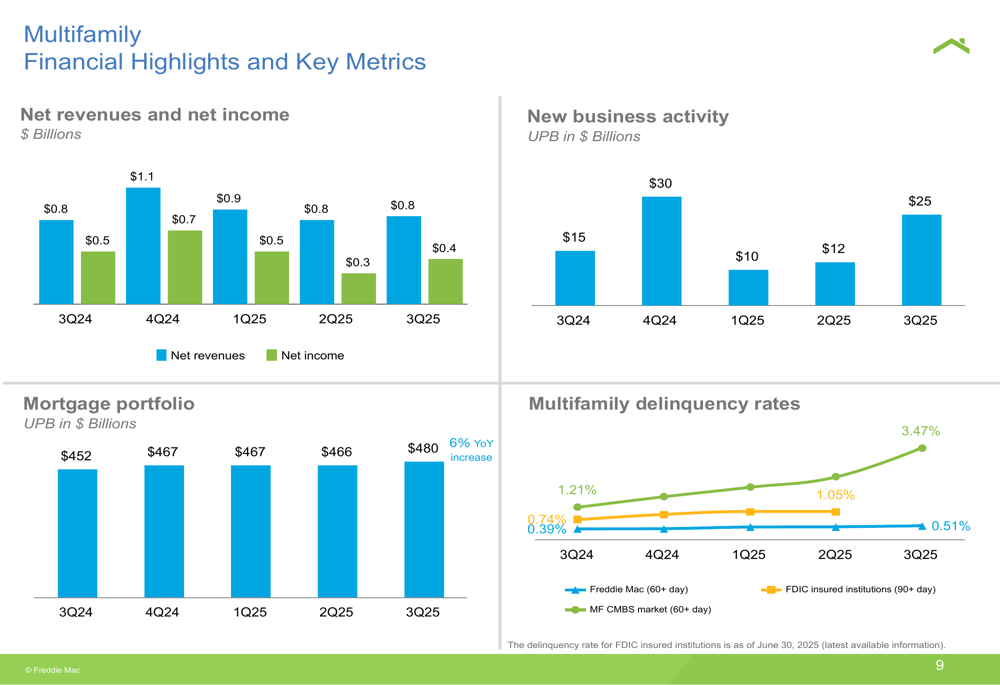 Freddie Mac reported net revenues of $5.7 billion for Q3 2025, representing a 2% year-over-year decrease. Net income declined more significantly, falling 11% to $2.8 billion compared to Q3 2024. According to the earnings call transcript, this decline was partly attributable to a $175 million provision for credit losses and a substantial 66% drop in non-interest income to $284 million.
