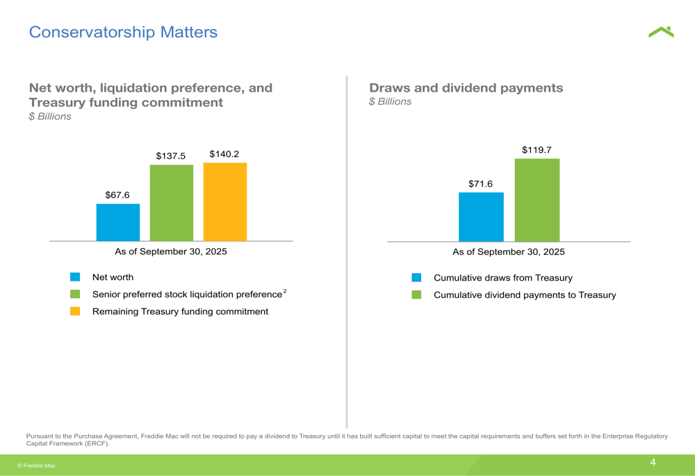 The company’s net worth reached $67.6 billion as of September 30, 2025, a significant improvement from previous years. Under the terms of its conservatorship agreement, Freddie Mac is not required to pay dividends to the Treasury until it meets capital requirements set forth in the Enterprise Regulatory Capital Framework (ERCF).