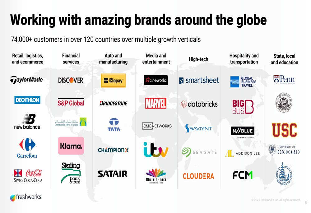 The presentation emphasized Freshworks’ broad customer base across multiple industries, as shown in this customer overview: