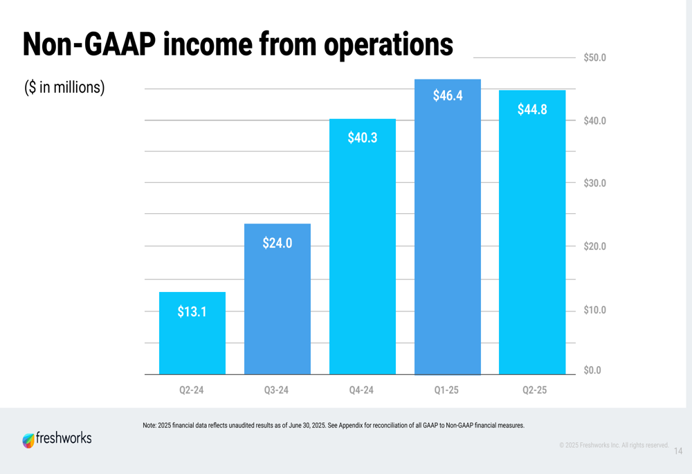 Beyond revenue growth, Freshworks demonstrated significant improvements in profitability metrics during Q2 2025. Non-GAAP income from operations reached $44.8 million, continuing an upward trend over the past five quarters: