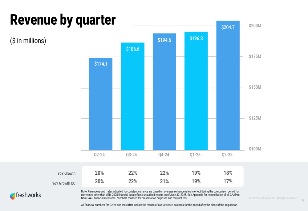 Freshworks’ Q2 2025 revenue reached $204.7 million, up 18% compared to the same period last year, or 17% on a constant currency basis. This continues the company’s pattern of steady growth over the past five quarters, as illustrated in the following revenue chart: