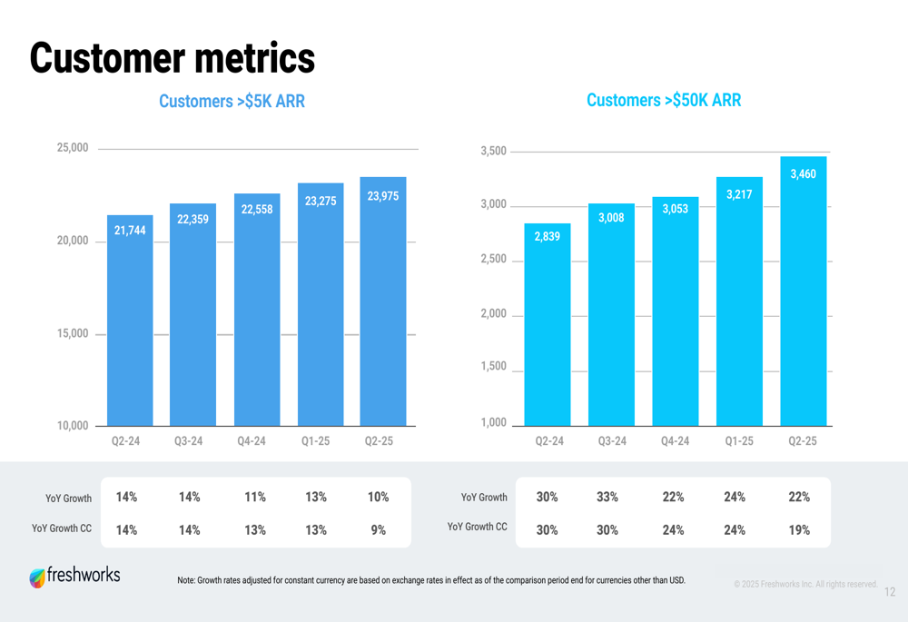 The company’s customer base expanded to over 74,600 customers across 120+ countries, representing an 8% year-over-year increase. More importantly, Freshworks demonstrated strong growth in higher-value customer segments.