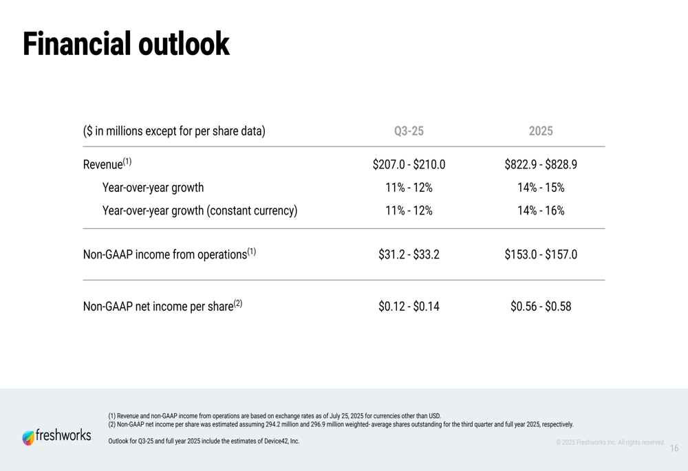 Freshworks provided a positive outlook for both Q3 2025 and the full year. For Q3, the company expects revenue between $207.0 and $210.0 million, representing 11-12% year-over-year growth. For the full year 2025, Freshworks forecasts revenue between $822.9 and $828.9 million, indicating 14-15% growth.