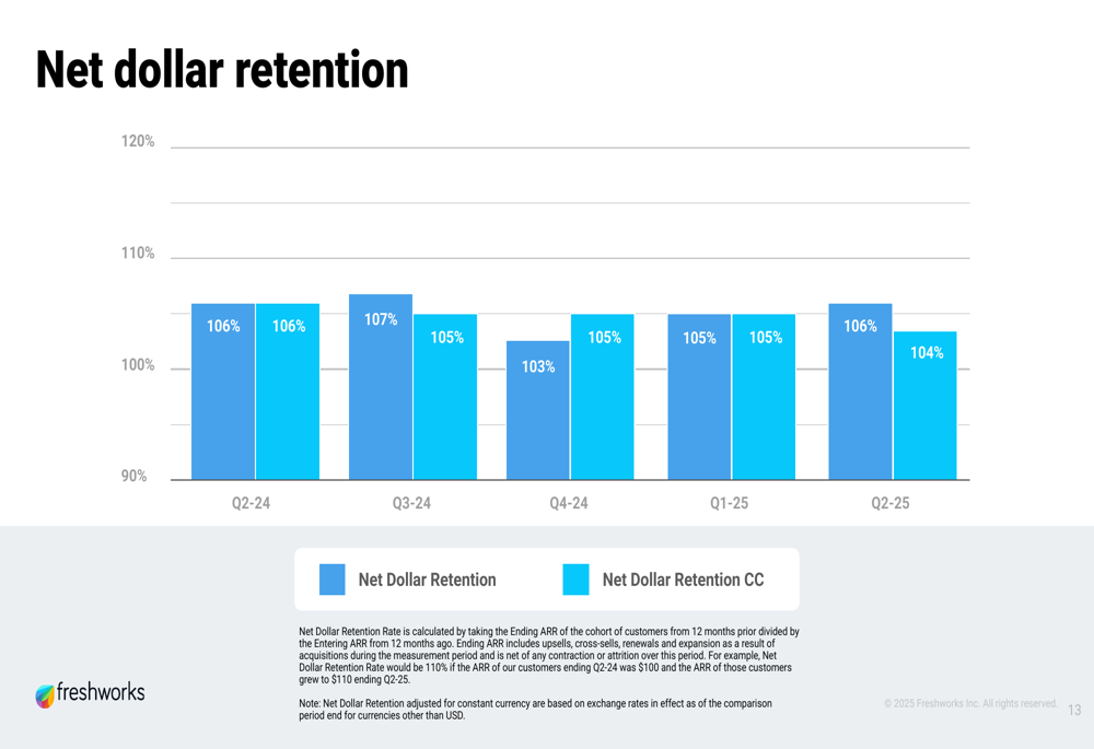 Freshworks maintained solid customer retention metrics, with Net Dollar Retention (NDR) at 106%, or 104% on a constant currency basis, indicating that existing customers are continuing to expand their usage of Freshworks products: