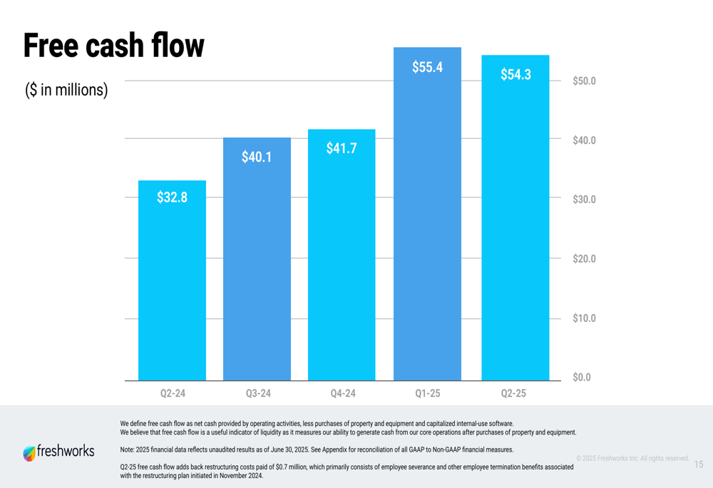 Free cash flow also showed strong performance, reaching $54.3 million in Q2 2025, compared to $32.8 million in Q2 2024, representing a 65% year-over-year increase: