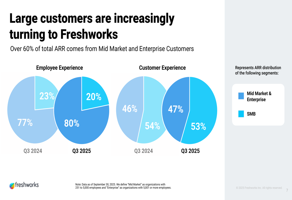A key strategic focus for Freshworks has been expanding its footprint with larger customers. The presentation revealed a significant shift in revenue composition, with mid-market and enterprise customers (organizations with more than 250 employees) now accounting for over 60% of total ARR.