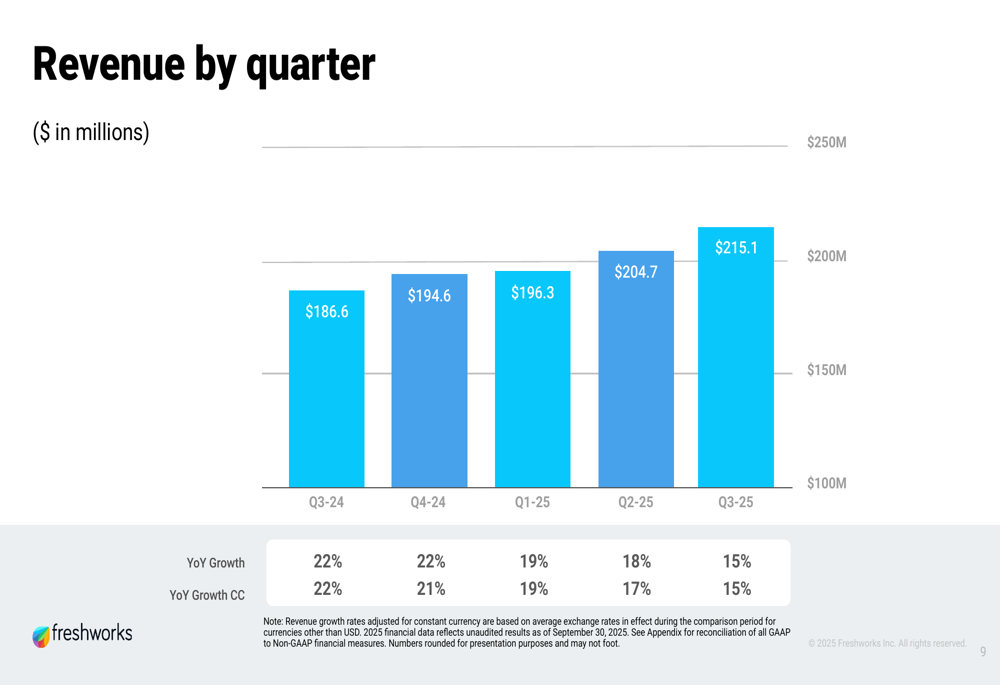 Freshworks Inc. (NASDAQ:FRSH) released its third quarter 2025 earnings presentation on November 5, revealing $215.1 million in revenue, a 15% year-over-year increase. The customer experience and IT service management software provider saw its shares rise 1.28% in after-hours trading to $10.96, reflecting investor confidence despite a growth rate that has gradually slowed from 22% a year ago.