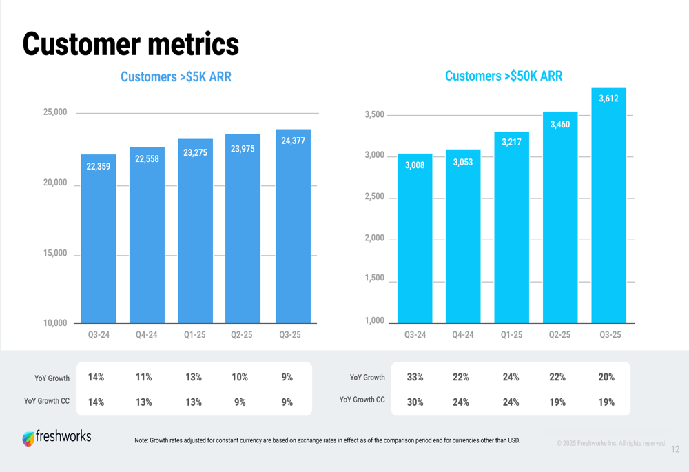 The company's customer base grew to nearly 75,000 paying customers across more than 120 countries, representing an 8% year-over-year increase. More significantly, Freshworks is seeing stronger growth in higher-value customer segments, with customers generating over $50,000 in annual recurring revenue increasing by 20% year-over-year to 3,612.
