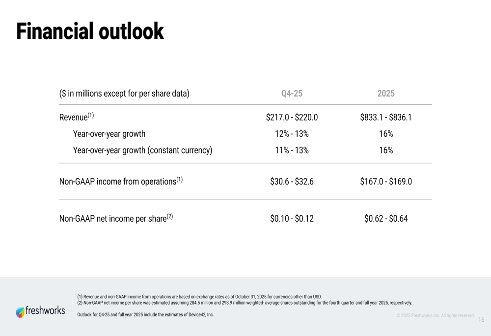 Looking ahead, Freshworks provided guidance for both Q4 2025 and the full year. For the fourth quarter, the company expects revenue between $217.0 and $220.0 million, representing 12-13% year-over-year growth. Non-GAAP income from operations is projected at $30.6 to $32.6 million with non-GAAP earnings per share of $0.10 to $0.12.