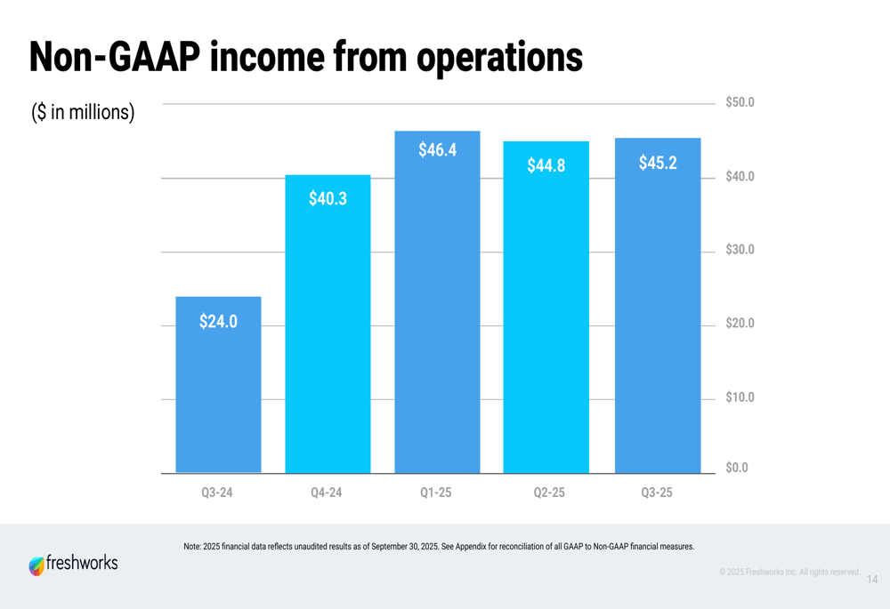 Beyond revenue growth, Freshworks demonstrated significant improvement in profitability metrics. Non-GAAP income from operations nearly doubled year-over-year to $45.2 million in Q3 2025, compared to $24.0 million in Q3 2024.