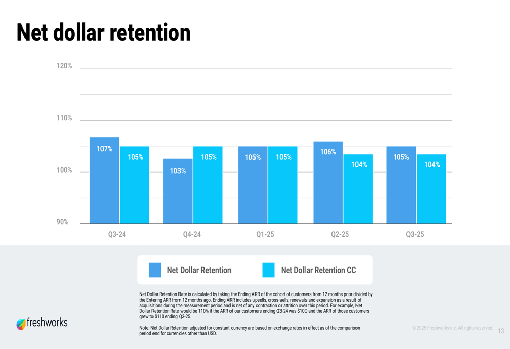 Freshworks' net dollar retention rate stood at 105% for Q3 2025, showing consistent customer spending patterns over the past five quarters: