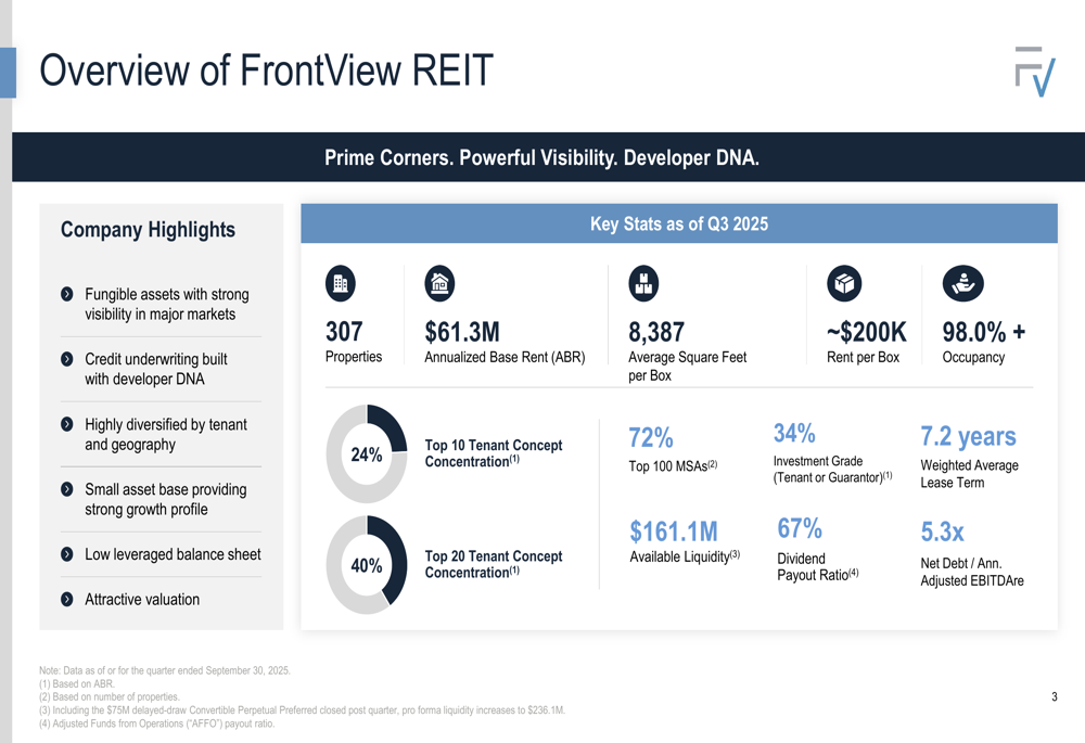 As shown in the following overview of FrontView REIT’s key metrics: