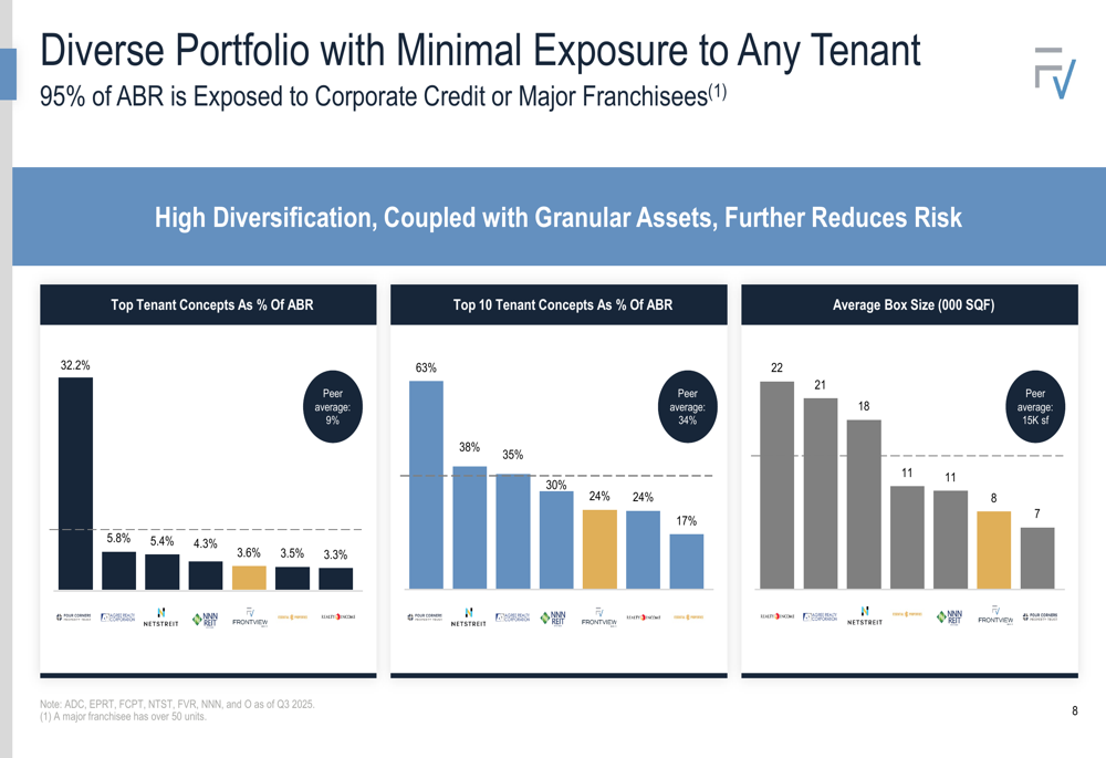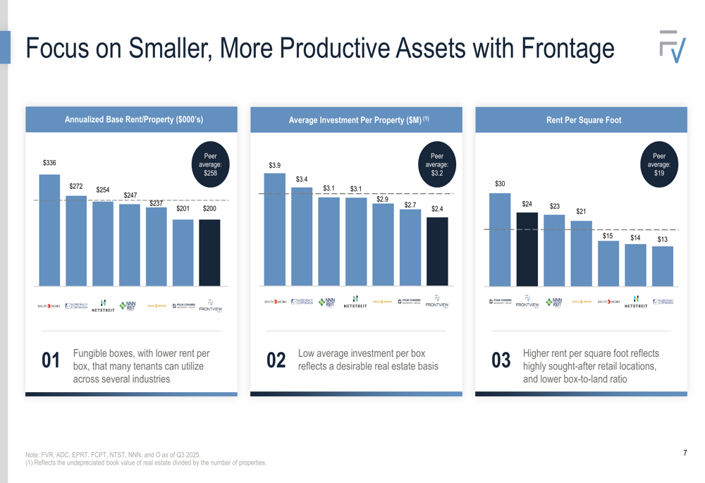 FrontView differentiates itself from peers through its focus on smaller, more productive assets with frontage on high-traffic roads. The company’s properties average 8,387 square feet, significantly smaller than the peer average of approximately 15,000 square feet, but generate higher rent per square foot.