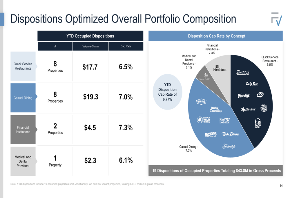 FrontView has been actively optimizing its portfolio through strategic acquisitions and dispositions. Year-to-date, the company has acquired 25 properties at an average economic yield of 8.31%, while selling 19 occupied properties for $43.8 million at an average cap rate of 6.8%.