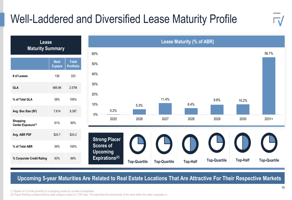 FrontView’s asset management approach is supported by its strong track record on lease renewals, with a 105% recapture rate since 2016. The company’s lease maturity profile is well-laddered, with 56.7% of leases expiring after 2031, providing stable cash flow visibility.