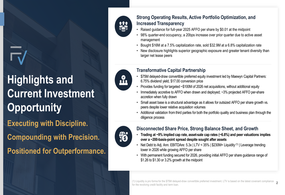 The most significant announcement in the presentation was a $75 million delayed-draw convertible perpetual preferred equity investment led by Maewyn Capital Partners. This strategic capital partnership features a 6.75% dividend yield and a $17.00 conversion price, representing approximately a 30% premium to recent trading prices.