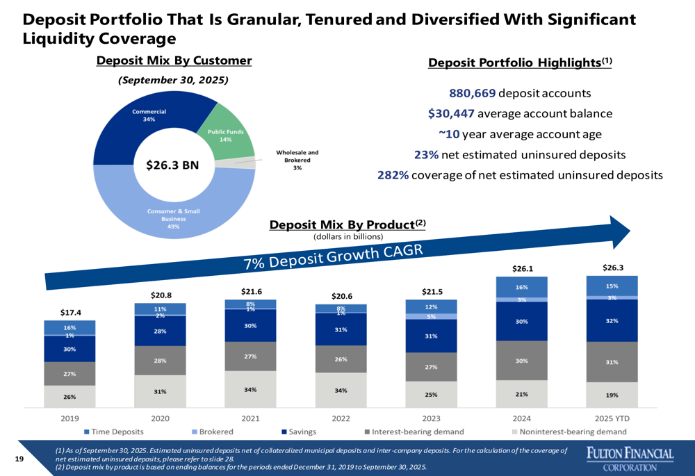 On the deposit side, Fulton maintains a granular and diversified base with 880,669 deposit accounts and an average account balance of $30,447. The company has successfully reduced its reliance on time deposits, which decreased from 26% of total deposits in 2019 to 19% in 2025 YTD, while increasing its proportion of savings and interest-bearing demand deposits.