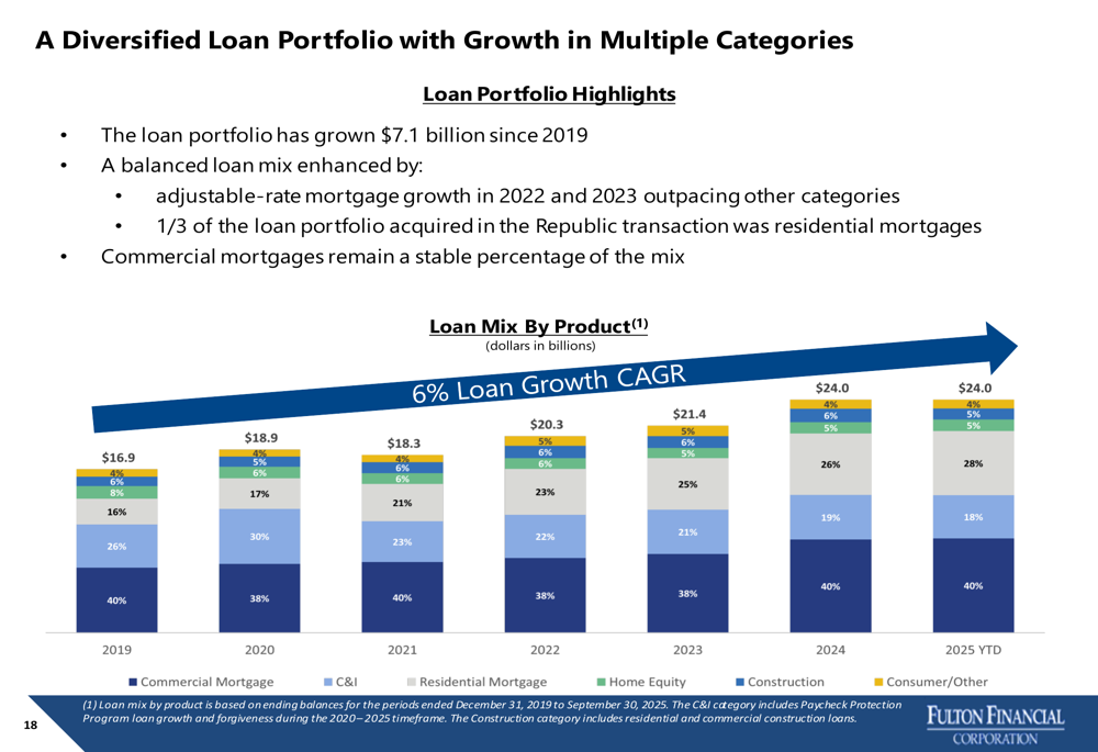 Fulton’s loan portfolio has grown by $7.1 billion since 2019, with a notable shift toward residential mortgages, which now comprise 28% of the portfolio compared to 16% in 2019. Commercial mortgages remain the largest component at 40%, while commercial and industrial (C&I) loans have decreased from 26% to 18% over the same period.