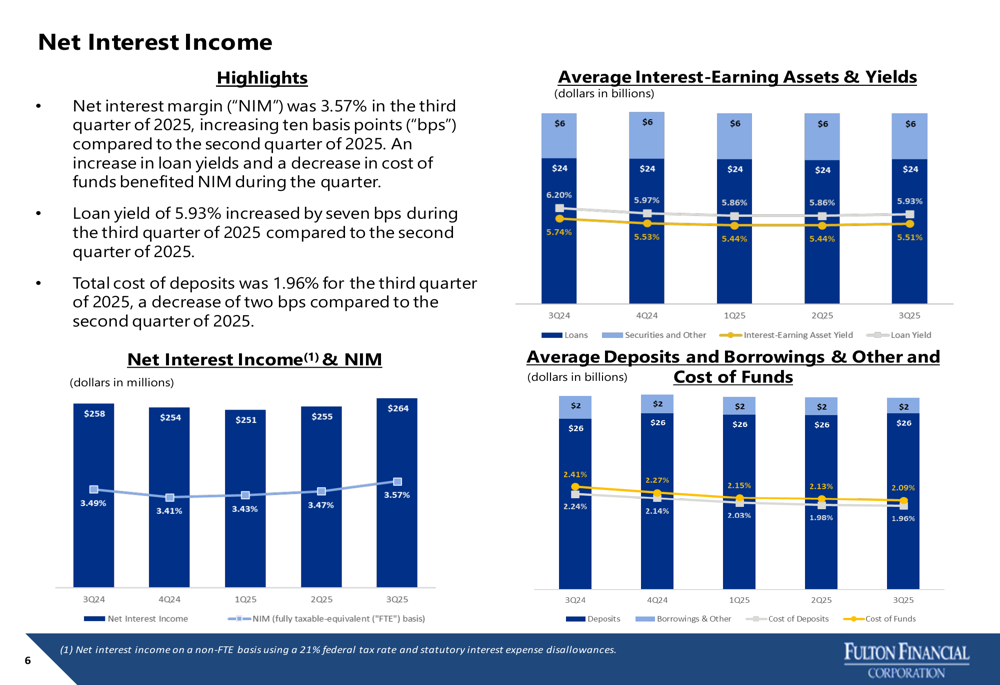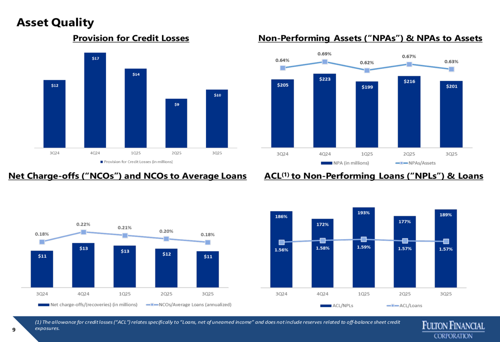 Fulton maintained stable asset quality metrics during the quarter. Non-performing assets decreased to $201 million (0.63% of assets) from $216 million (0.67%) in the previous quarter. Net charge-offs declined to $11 million (0.18% of average loans) from $12 million (0.20%).