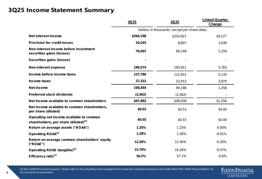 Fulton Financial reported GAAP net income available to common shareholders of $97.9 million for Q3 2025, a slight increase from $96.6 million in Q2 2025. On an operating (non-GAAP) basis, net income reached $101.3 million, up from $100.6 million in the previous quarter.