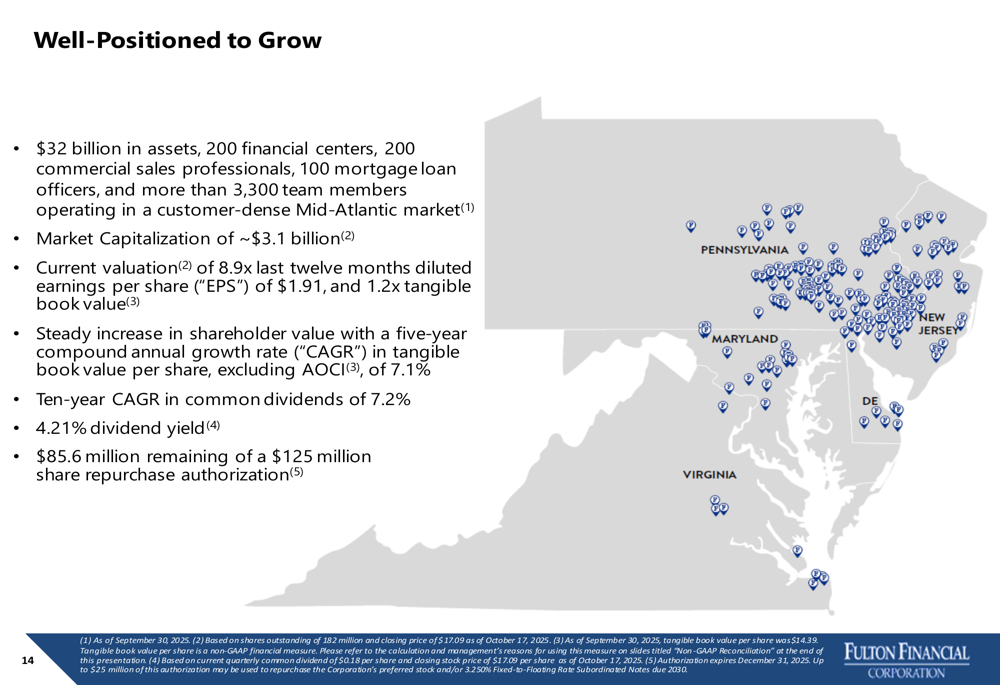 Fulton Financial operates 200 financial centers across Pennsylvania, Maryland, Virginia, Delaware, and New Jersey, positioning itself as a community bank with regional scale. The company’s market capitalization is approximately $3.1 billion, with current valuation at 8.9x trailing twelve months diluted EPS of $1.91 and 1.2x tangible book value.