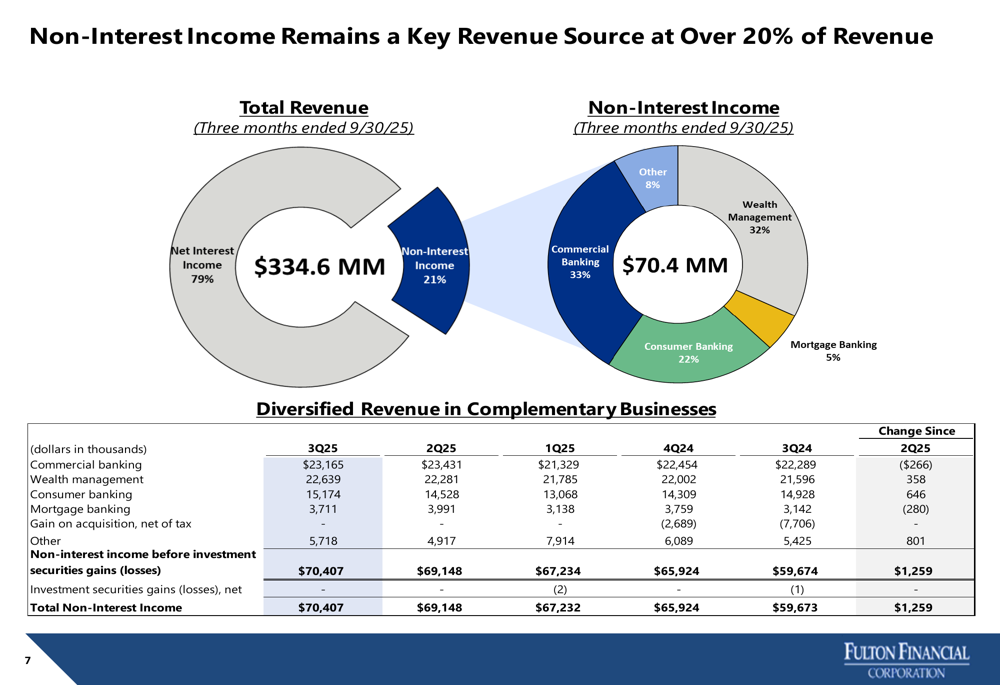 Fulton’s revenue streams remain well-diversified, with non-interest income accounting for 21% of total revenue. Commercial banking and wealth management represent the largest contributors to non-interest income at 33% and 32%, respectively.