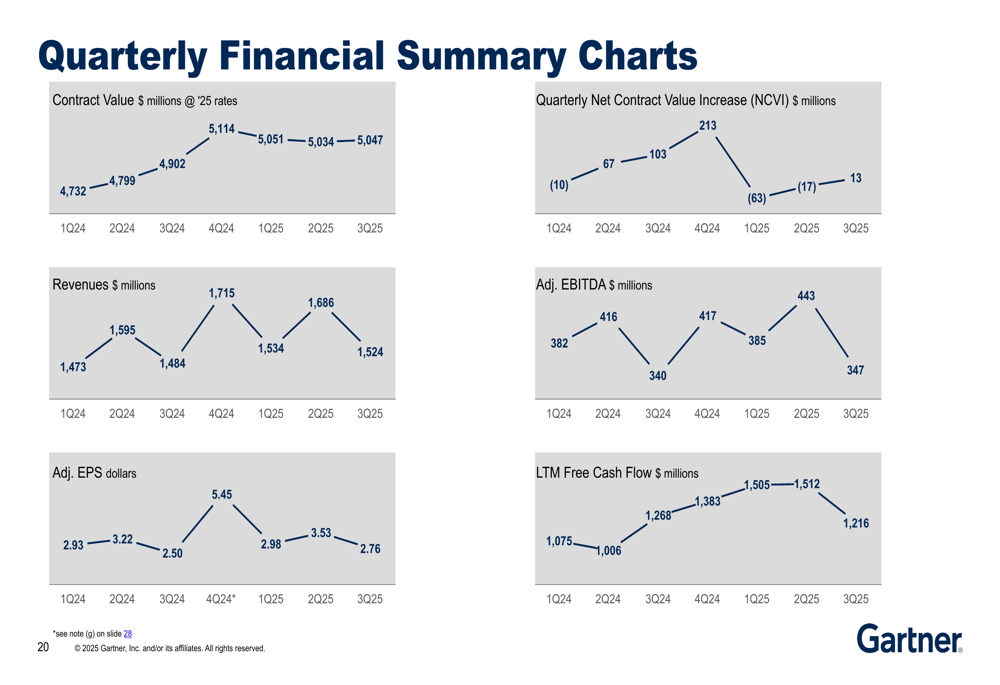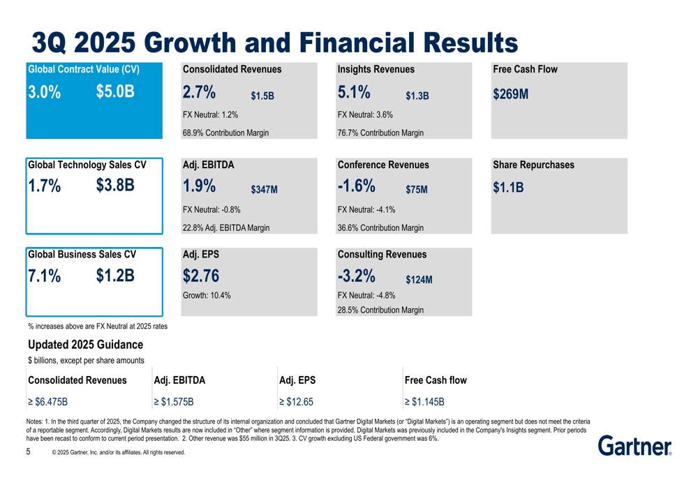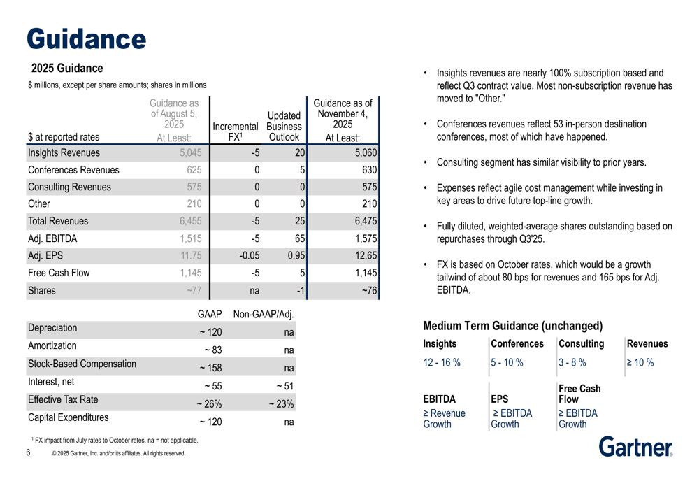 Gartner raised its full-year 2025 guidance, projecting consolidated revenues of at least $6.475 billion, adjusted EBITDA of at least $1.575 billion, and adjusted EPS of at least $12.65. The company also expects free cash flow of at least $1.145 billion for the year.