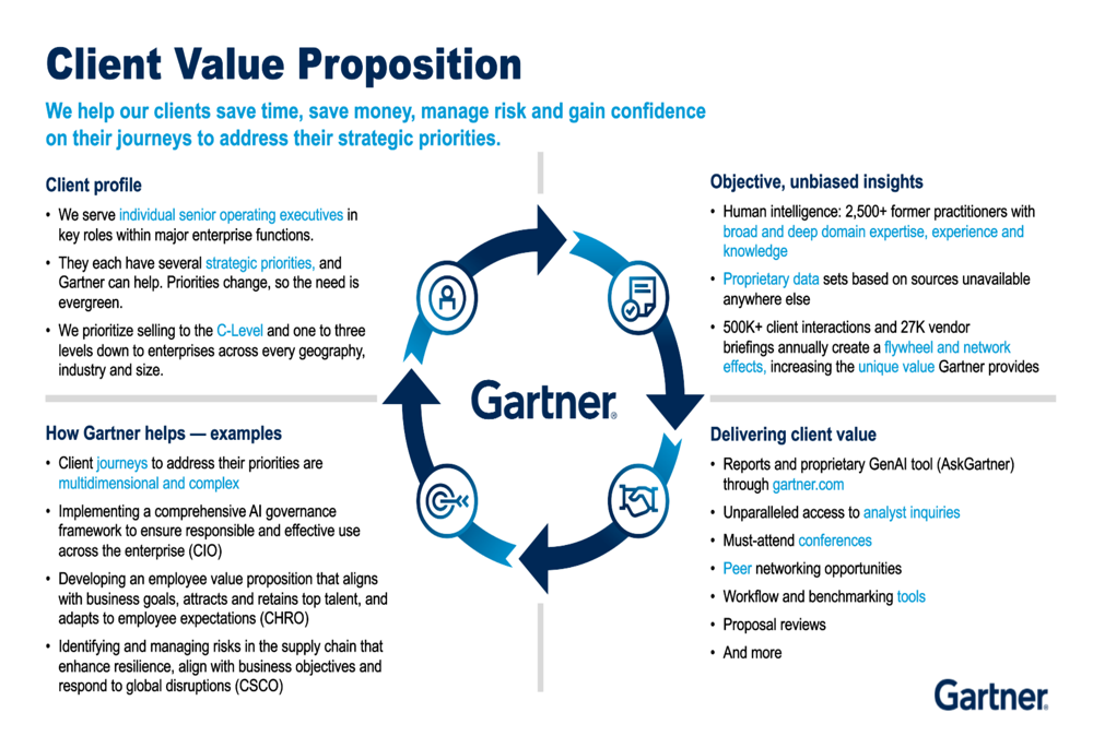 The company’s client value proposition is built around providing objective, unbiased insights through various delivery channels, including reports, analyst inquiries, conferences, networking, and benchmarking. This approach is supported by 2,500+ former practitioners and proprietary data from over 500,000 client interactions and 27,000 vendor briefings annually.