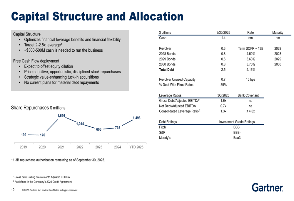 Gartner maintains a strong financial position with $1.4 billion in cash and $2.5 billion in total debt as of September 30, 2025. The company targets a leverage ratio of 2-2.5x and has $0.7 billion in unused revolver capacity.