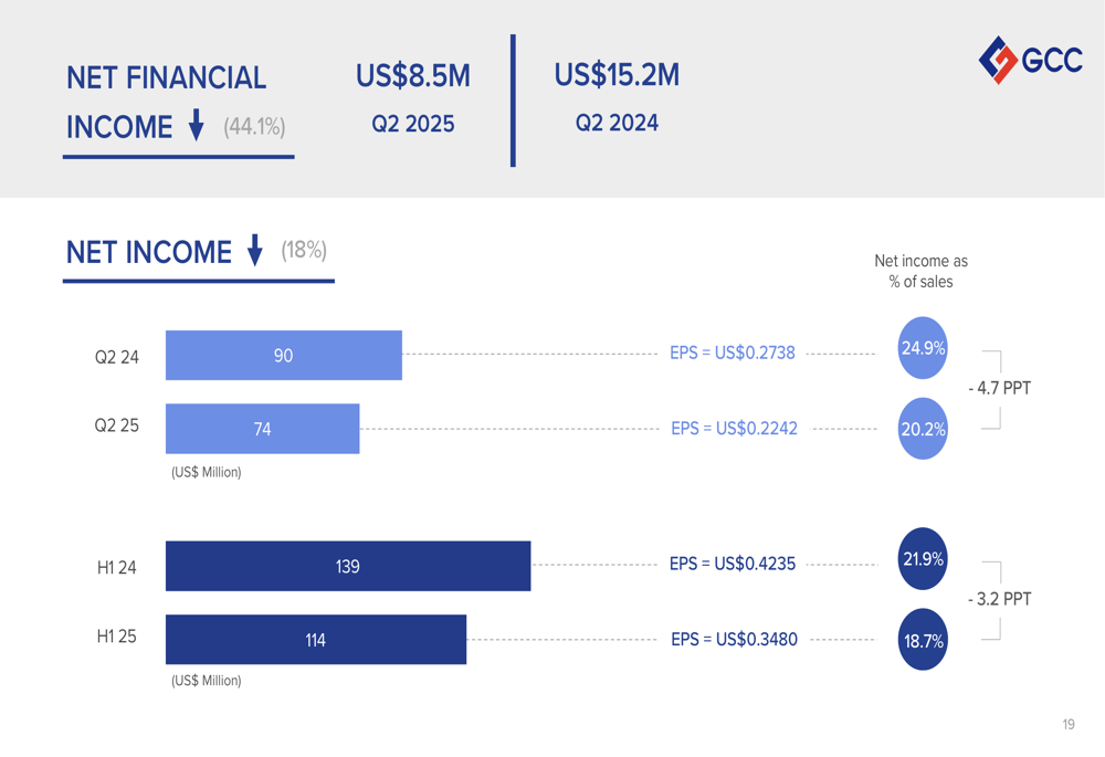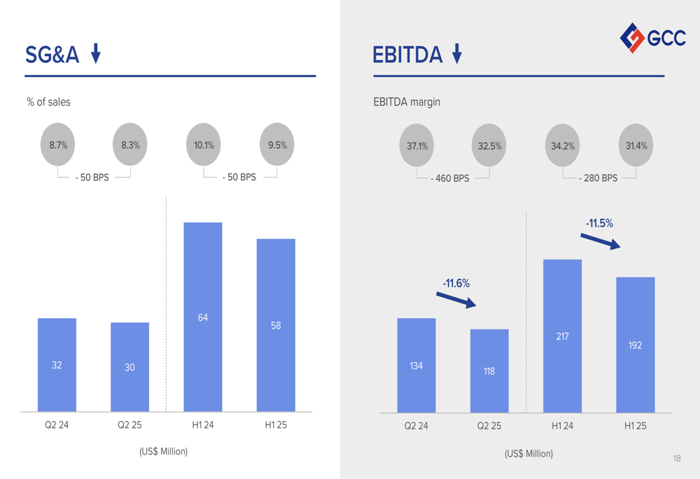 GCC’s Q2 2025 results showed consolidated net sales of $363.9 million, a slight increase from $360.3 million in the same period last year. However, the company’s EBITDA declined to $118.4 million from $133.9 million, with margins contracting from 37.1% to 32.5%.